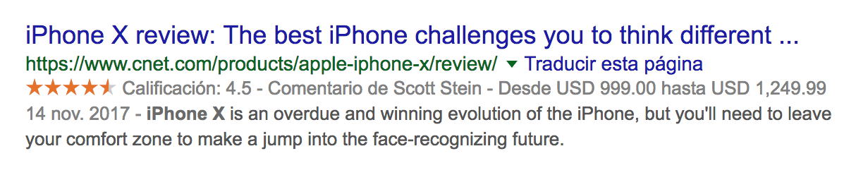 Los snippets enriquecidos son fragmentos de información mostrados durante el resultado de una búsqueda. Estos se añaden a los textos meta descriptivos, donde un resultado puede entregar información extra, como precio, reviews e incluso navegación extra como breadcrumbs o buscar dentro del sitio.