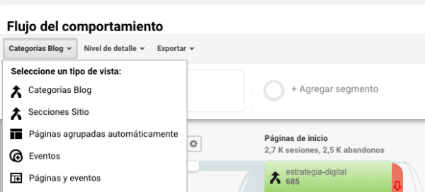 - Tipo de vista: Permite seleccionar las agrupaciones o eventos que se mostrarán en el gráfico. Por ejemplo, se puede cómo navegaron los usuarios entre secciones del sitio o entre categorías del blog.