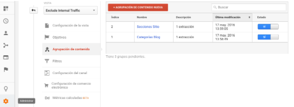 Las agrupaciones de página se configuran desde la administración general de la vista de la cuenta. El “Administrador”, “Agrupación de contenido”, puede agregar o modificar los grupos.