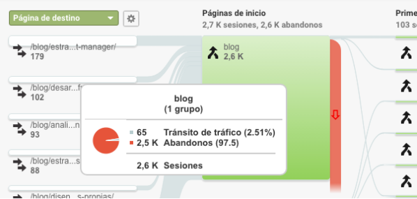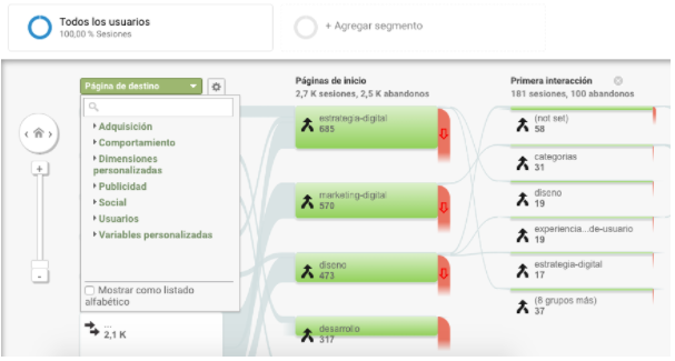Por defecto, el gráfico está configurado para mostrar el flujo desde la página de destino. Sin embargo, se puede cambiar la dimensión para estudiar, por ejemplo, el comportamiento desde las distintas fuentes de tráfico, medios o redes sociales, entre otros.