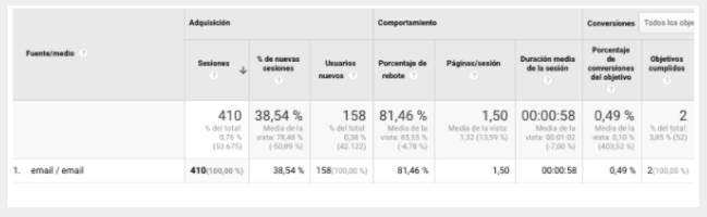 En Fuente/medio se puede seleccionar la fuente email para ver el número de sesiones, los nuevos usuarios, porcentaje de rebote, páginas por sesión y objetivos cumplidos.