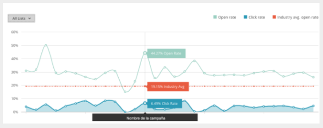 En Mailchimp, por ejemplo, existen reportes generales que muestran la tasa de apertura y la tasa de clics de cada campaña, comparados con los datos de la industria.