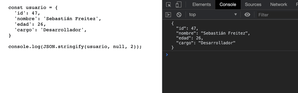 const usuario = { id: 47, nombre: 'Sebastián Freitez', edad: 26, cargo: 'Desarrollador', } console.log(JSON.stringify(usuario, null, 2)); //Resultado: //{ // "id": 47, // "nombre": "Sebastián Freitez", // "edad": 26, // "cargo": "Desarrollador" //}![]()