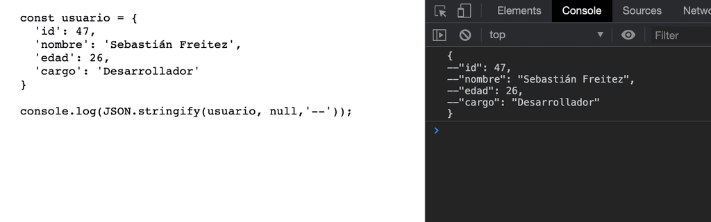 const usuario = { id: 47, nombre: 'Sebastián Freitez', edad: 26, cargo: 'Desarrollador' } console.log(JSON.stringify(usuario, null,'--')); //Resultado: //{ //--"id": 47, //--"nombre": "Sebastián Freitez", //--"edad": 26, //--"cargo": "Desarrollador" //}![]()