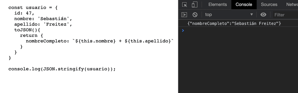 const usuario = { id: 47, nombre: 'Sebastián', apellido: 'Freitez', toJSON(){ return { nombreCompleto: this.nombre + ' ' + this.apellido } } } console.log(JSON.stringify(usuario)); //Resultado: {"nombreCompleto":"Sebastián Freitez"}![]()