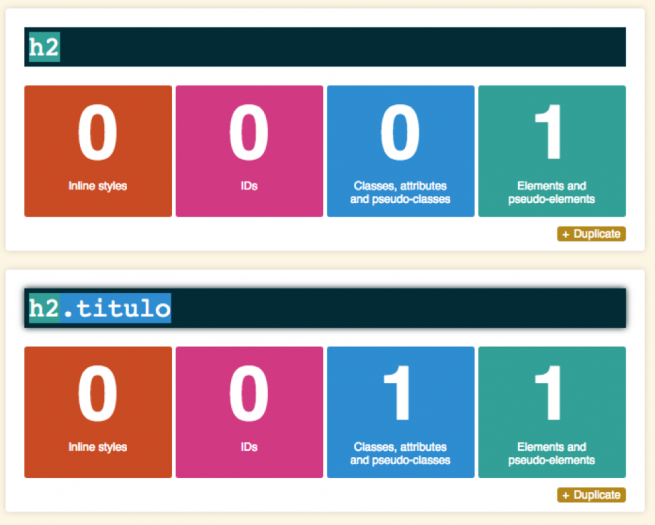 En este caso ambos apuntan al mismo elemento H2. Arriba sólo utiliza el elemento y abajo está un elemento + una clase, lo que le da una puntuación de 11.