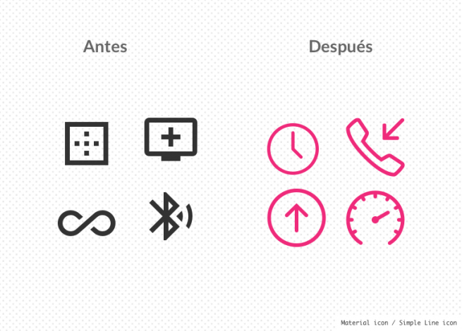 - Peso visual: Es preferible seguir la misma línea gráfica de la iconografía preexistente, al menos en el grosor de las líneas, así no tendremos problemas de predominancia sobre botones de acción.