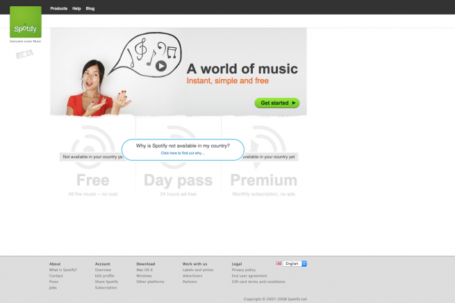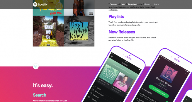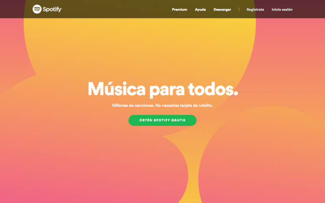 Si bien Spotify concentra sus funcionalidades en su aplicación, resulta interesante ver cómo ha cambiado la forma en que venden este servicio. En ese sentido, un elemento que llama la atención inmediatamente es la burbuja de texto que funciona como un elemento flash que re-dirige luego a un video promocional.