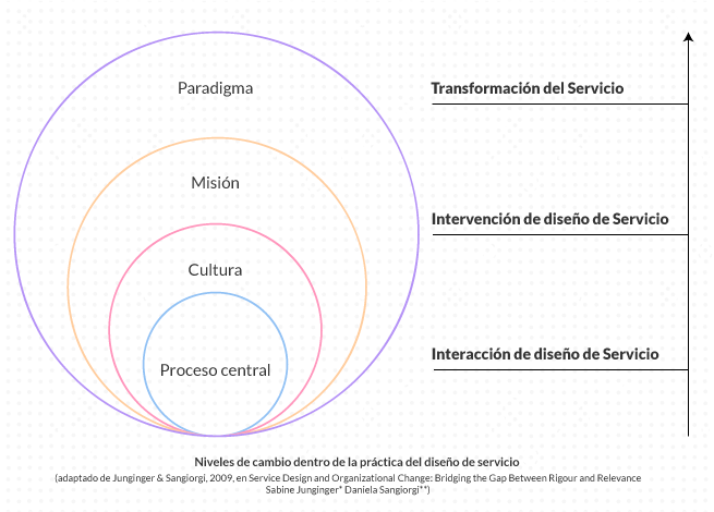Revisemos lo que plantea Simon Clatworthy en su artículo en la International Journal of Design. Según Clatworthy, desde una perspectiva de diseño de servicio, los proyectos que mejoran las interacciones de servicio y los puntos de contacto (diseño de interacción del servicio) o que ayudan a redefinir valores, normas o filosofía del servicio (intervenciones del servicio), no necesariamente tienen un impacto transformador en el nivel paradigmático de la organización (transformación del servicio).