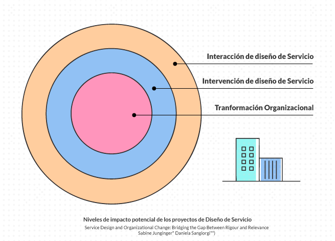 Desde la investigación, Sangiorgi establece que los procesos de diseño de servicio pueden ganar diferentes niveles de profundidad en la organización, provocando diferentes tipos de resultados e impactos.