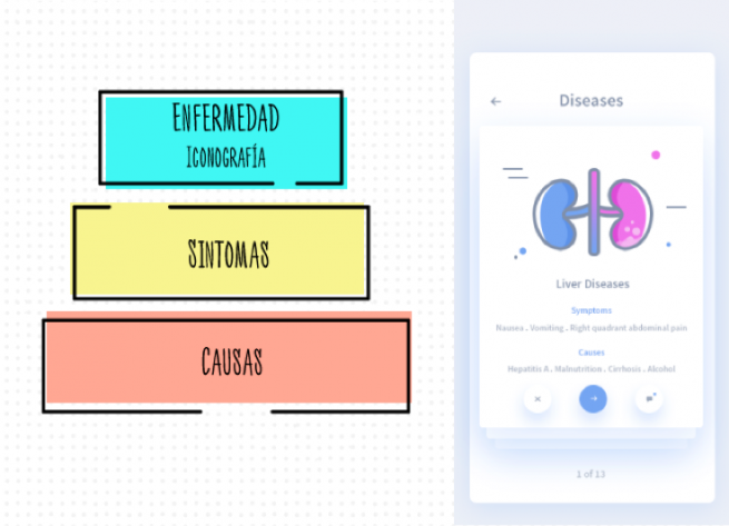 Conceptualizar grupos de información y traducirla al usuario, es una de las tareas más complejas dentro del proceso de diseño para la ciencia. Lo recomendable es poder fragmentar esta información en pequeños módulos que sean comprensibles e ir uniendo eslabones con otros hasta concebir una idea con la forma adecuada al usuario. En el ejemplo podemos ver un concepto de aplicación médica, que muestra enfermedades tratables, síntomas y causas de éstas, acompañada de una iconografía apropiada para el tipo de información.