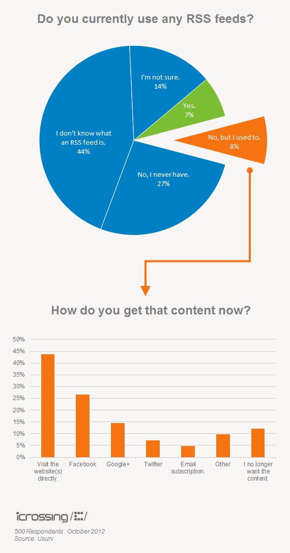 El RSS (Really Simple Syndication), formato XML para compartir contenidos en Internet, tomó relevancia a comienzos del 2000, usado principalmente para la lectura rápida de gran cantidad de fuentes de información en la web. Tanta fue su repercusión que en 2005 Google lanzó Google Reader, lector y administrador de RSS que surgió directamente de sus Labs. Pese a la valoración de los usuarios, su popularidad comenzó a decaer en los últimos años. En marzo de 2013 Google anunció que mataría el servicio en julio del mismo año, ofreciendo alternativas de migración para quienes mantenían grandes listados de fuentes de información web. Esta decisión puede entenderse al constatar que el uso de las meta etiquetas para RSS han caído en lo sitios web, alrededor de 18% al año. Desde el lado de los usuarios, una encuesta de la empresa ICrossing, realizada a 500 usuarios en 2012, demostró que: