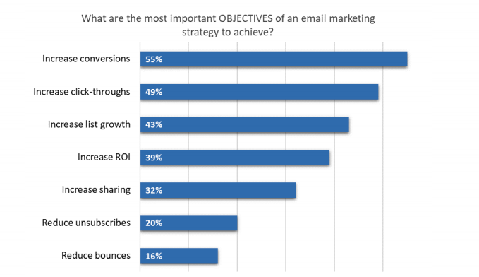 El estudio realizado por ascend2 también indagó en este factor. Para gran parte de los consultados el principal objetivo de una campaña de email marketing es incrementar las conversiones (55%).