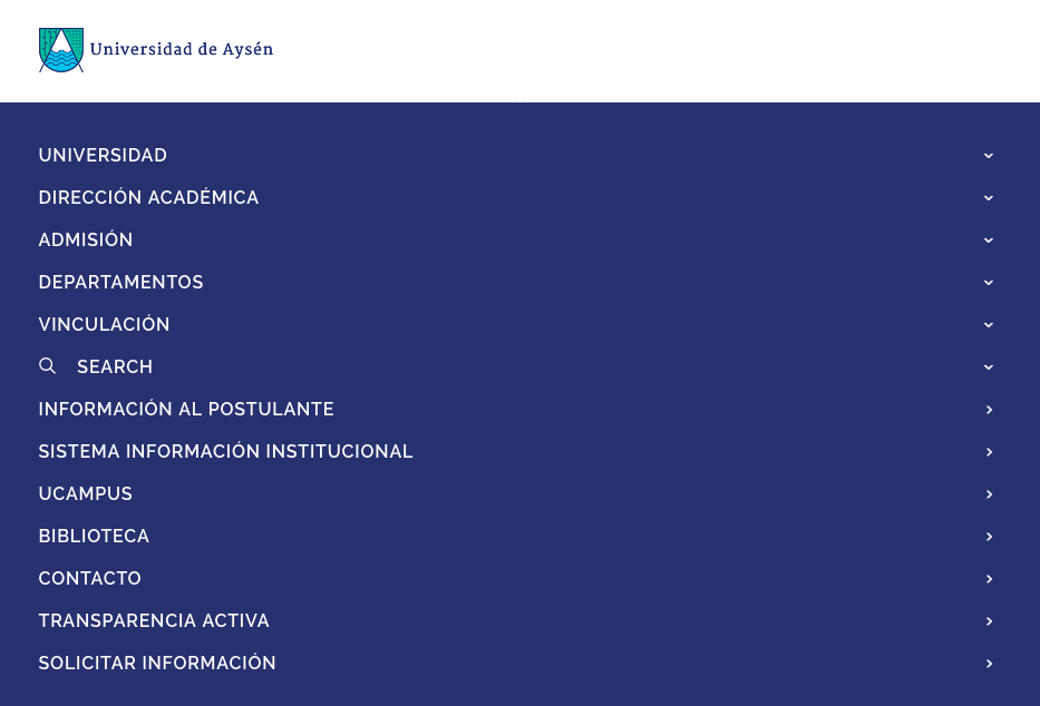 Por ejemplo, la Universidad de Aysén relega el enlace a un espacio al fondo de su menú principal: