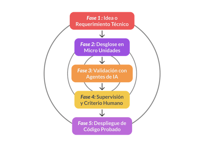 Este modelo es posible gracias al diseño de agentes especializados que permiten esta atomización en ciclos de micro desarrollo. Lo más importante es que se apoya en una supervisión humana activa que gestiona las imprecisiones propias de las IA en el momento en que aparecen. Al fragmentar el avance en unidades mínimas, resulta más simple visualizar la lógica y perfeccionar cualquier error antes de seguir con el siguiente bloque.
