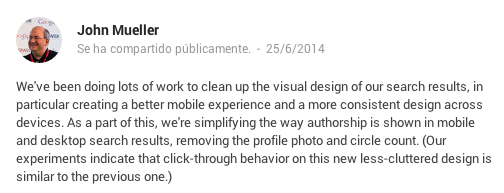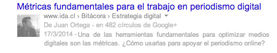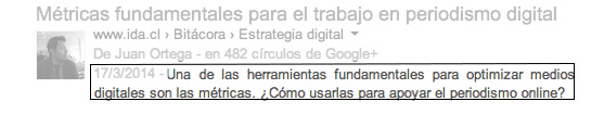 <title>Escribe aquí hasta 70 caracteres con tus palabras claves relevantes</title> Esta es probablemente la metaetiqueta más importante. Considera distintas métricas y resultados de búsqueda para escoger las palabras claves que más utilizan los usuarios que quieras atrapar, para ayudarlos a encontrar los contenidos que están buscando. Usa máximo 70 caracteres, si te pasas Google cortará tus títulos o los re escribirá para mostrar lo que considera más relevante. <meta name=”description” content=”155 caracteres que resuman tu contenido”> Aprovecha este espacio para incluir las palabras claves más relevantes para los usuarios y variaciones de estas. Para esto puedes apoyarte en la herramienta para palabras clave de Adwords. Recuerda que los usuarios están buscando activamente contenidos, a diferencia de las redes sociales, donde ellos escanean pasivamente la información. Piensa en los problemas o necesidades informativas que puedan tener y redacta tus descripciones pensando en ofrecer soluciones a estos. <a href=”URL de tu perfil de google?rel=author”>Google</a> Google sigue buscando formas de hacer indispensable interactuar con su red social G+. Una de las formas que encontró fue potenciar los resultados de búsqueda con la metaetiqueta Author. Por ejemplo, Russell Jensen incrementó el tráfico a su blog sobre rutinas de ejercicio en un 38% solo incluyendo esta metaetiqueta. Otro caso es el de Cyrus Shepard, quien no tuvo resultados en un comienzo, pero al optimizar adecuadamente esta metaetiqueta consiguio un 35% más de visitas. Enlaza tu cuenta de Google+ a tu página para aparecer como el autor de los contenidos en los resultados de búsqueda. La página SERP mostrará los resultados enriquecidos con tu fotografía y enlace a tu perfil en Google Plus. Esto ayudará a que tu contenido destaque entre los resultados y que los usuarios perciban tus textos como provenientes de una fuente confiable y valiosa. Para configurar esta funcionalidad debes poseer un correo con el dominio del sitio donde publicas y autorizarlo desde Google+. También existe una forma de enlazar tu perfil personal a sitios donde colaboras. Puedes obtener más información en el sitio de Google Plus sobre Authorship. “Hemos estado trabajando para limpiar el diseño visual de nuestros resultados de búsqueda, en particular creando una mejor experiencia móvil y un diseño más consistente a través de aparatos. Como parte de esto, simplificamos la forma en que la autoría se muestra en los resultados de búsqueda en móviles y en escritorio, removiendo la foto de perfil y la cuenta de círculo. (Nuestros experimentos indican que el comportamiento de click-through en este nuevo diseño es similar al anterior)”, John Mueller, Webmaster Trends Analyst de Google. <a href=”https://plus.google.com/[ID de tu página]” rel=”publisher” /> Enlaza tu página con tu sitio en Google+ para mostrar a la empresa dueña del contenido de un sitio o blog. Este es un buen método para reforzar una marca ya que permite agregar el logo y destacar entre otros resultados. Además, tus usuarios lo percibirán como una muestra de profesionalismo, transparencia e interés por entablar una comunicación enriquecedora. Título