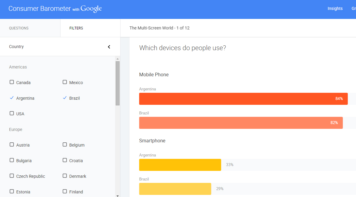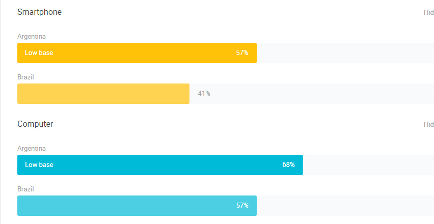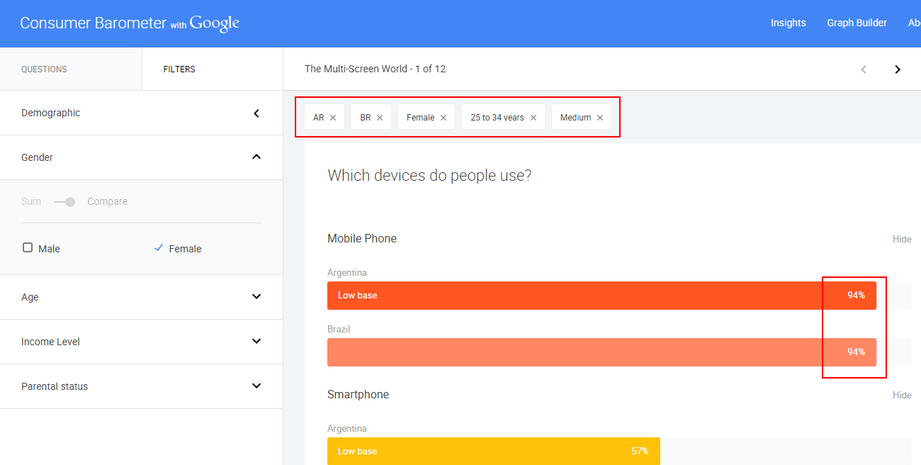 Por ejemplo, si quisieras saber qué tipo de aparato es el más usado por mujeres entre 25 y 34 años, de nivel de ingresos medio en Sudamérica, tendrías que empezar filtrando la localidad. Brasil y Argentina son los dos únicos representantes en este estudio.