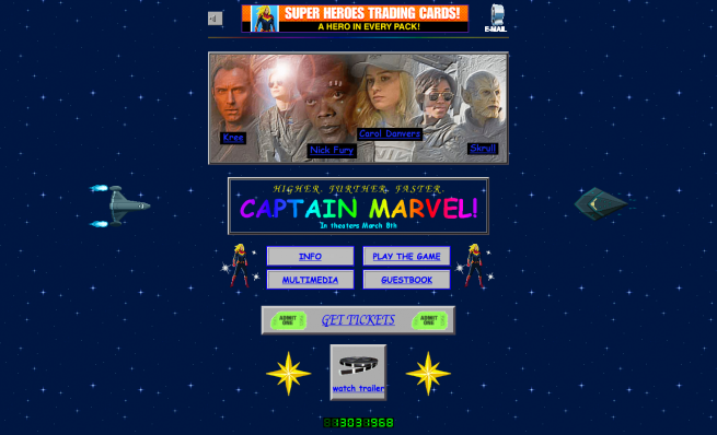 El sitio web capitainmarvel.com, lanzado por Marvel para promocionar la película, simula las creaciones en HTML de hace 20 años. Es una exploción de nostalgia que nos hace pensar en los primeros computadores y sencillamente, motiva a ver la película con un interés mayor que antes. Apela a las emociones de esos recuerdos de juventud que nadie quiere olvidar.